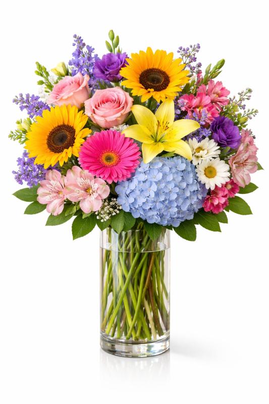 Thoughtfully designed to express comfort and remembrance, this elegant vase arrangement features a harmonious blend of fresh, classic blooms in soft yet uplifting tones. Seasonal florals are artfully arranged in a tall clear glass vase, creating a graceful and serene presentation. This timeless design offers a beautiful way to share sympathy, honor a life, and provide a sense of peace during times of loss.