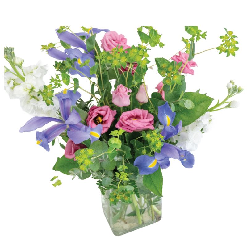 Spring Awakening captures the beauty of the season as it comes to life. Featuring graceful purple iris, soft mauve lisianthus, and fragrant white stock, this arrangement is accented with airy eucalyptus and festive spring foliage. Designed in a tall rectangular glass vase, the look is fresh, modern, and elegant—perfect for welcoming spring, celebrating new beginnings, or brightening any space with seasonal charm.