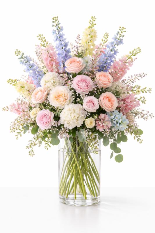 Soft, airy, and beautifully refined, this tall pastel arrangement is designed to make a graceful statement. Featuring a lush blend of pastel colors, this bouquet is artfully arranged with premium greenery in a clear glass vase.
