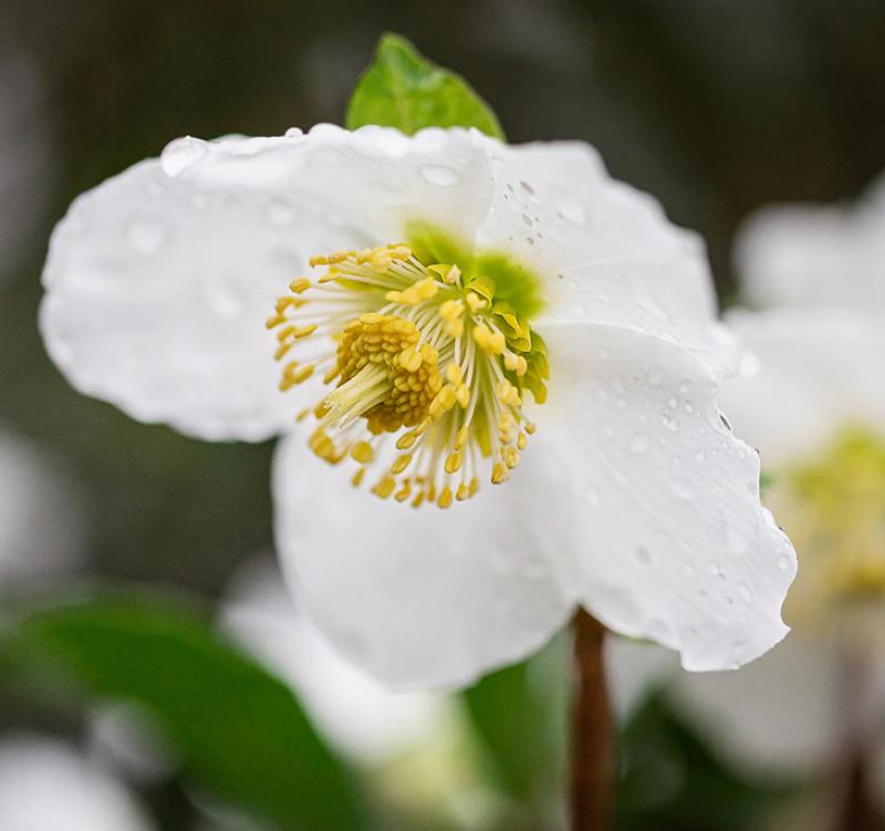 Gold Collection Jacob Lenten Rose. Large, white, slightly fragrant, outward facing flowers with golden stamens. Blooms turn rose pink in cool temperatures and pale green in warmer weather. Thick, green, leathery foliage. Deer resistant. Evergreen perennial. Zones 5-8. Part to full shade. 14 in. tall and wide