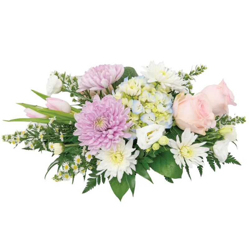 Fresh, soft, and effortlessly elegant, April Air captures the gentle beauty of spring in full bloom. Lush lavender mums and crisp white daisies mingle with delicate blush roses, pastel tulips, airy hydrangea, and petite accent blooms to create a light and graceful centerpiece. The soothing palette of pinks, lavenders, whites, and hints of blue evokes a peaceful garden just beginning to awaken.