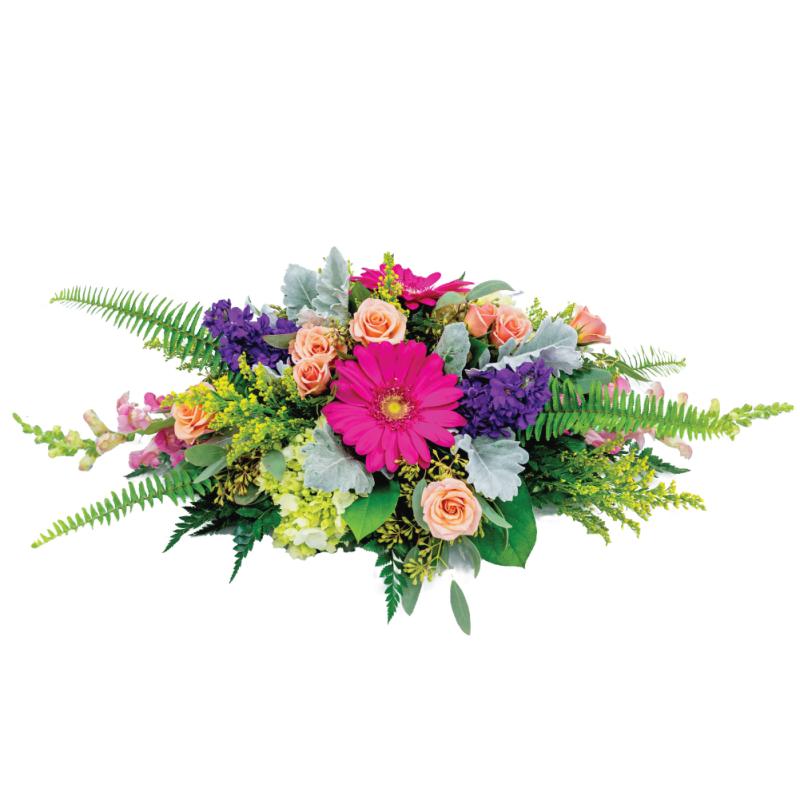 This vibrant floral centerpiece is designed to make a bold yet elegant statement. Featuring a striking hot pink gerbera daisy as the focal point, it’s beautifully accented with soft peach roses, rich purple blooms, and layers of fresh greenery. Textural elements and varied foliage create depth and movement, making this arrangement perfect for a dining table, celebration, or special gathering. Lush, colorful, and thoughtfully balanced, this centerpiece brings warmth, cheer, and natural beauty to any space.