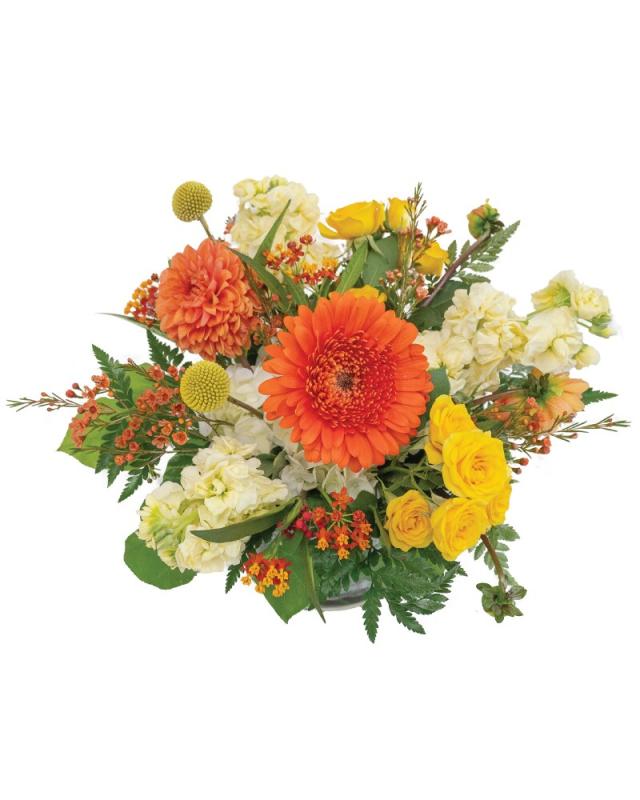 A modern short-compact design bursting with sunny colors of oranges and yellows. This arrangement includes orange gerbera daisies, light yellow stock, and yellow spray roses accented with lush foliage. Sure to brighten anyone's day!