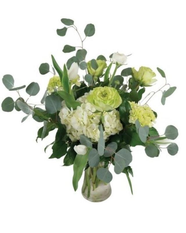 A refreshing blend of soft whites and lush greens, this contemporary arrangement showcases green hydrangea, white hydrangea, green lisianthus thoughtfully accented with premium eucalyptus and seasonal foliage. Designed in a clear glass vase, the clean lines and organic textures create a naturally elegant look that feels both modern and timeless.