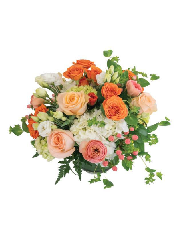 This radiant arrangement blends warm peach and soft orange roses with crisp white blooms, accented by fresh greenery and delicate textural details. Designed in a full, rounded style, it offers a perfect balance of color, softness, and natural movement. Fresh and inviting, this bouquet is ideal for birthdays, celebrations, thank-you gifts, or simply bringing a cheerful pop of color into any space. Thoughtfully crafted to feel abundant and timeless, it’s a beautiful choice for any occasion.