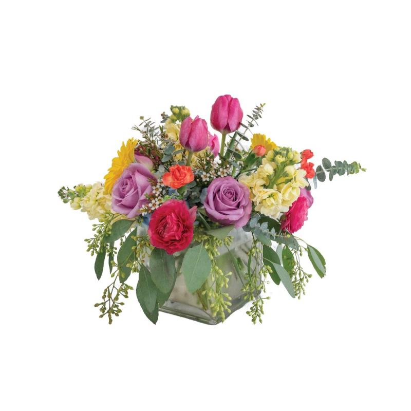 A vibrant mix of beautiful purples, yellows, and reds that include spray roses, ranunculus, stock, tulips, hydrangea, and gerbera daisies. This lush garden-inspired design is sure to make an impression, no matter the reason.