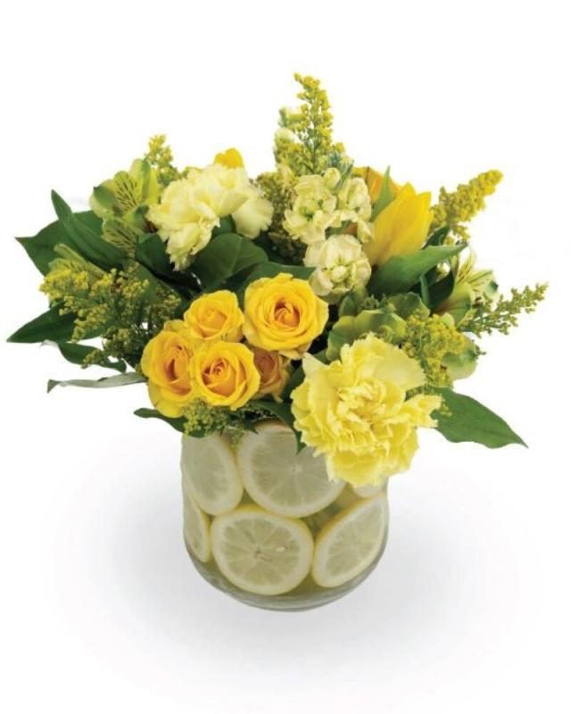 Citrus doesn't get any cuter than this! Designed with slices of real lemons, roses, mums and and accent flowers in a bubble bowl.
