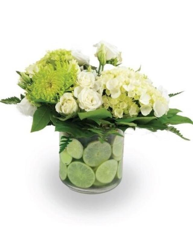 Citrus doen't get any cuter than this! Photo shown of the standard size. Designed with slices of real limes, mini green hydrangea, carnations, and green button mums in a bubble bowl.