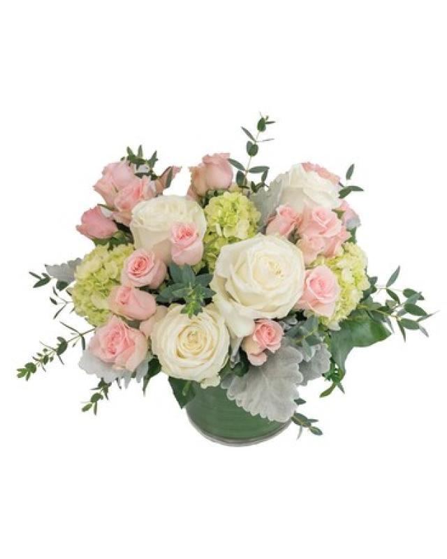 A cheerful mix of roses, spray roses and dusty miller in a sweet, soft palette of baby pinks and cream.
