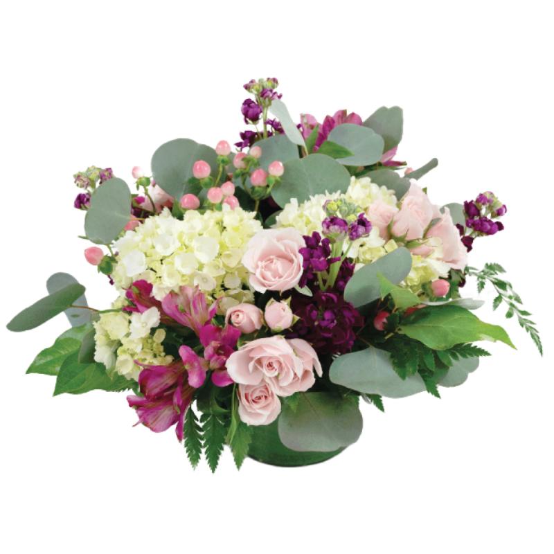 A lush, garden-inspired floral arrangement featuring a harmonious blend of soft blush and green blooms accented by rich plums and berry tones. Designed with abundant texture and layered greenery, this low, full arrangement showcases natural movement and depth from every angle. The balanced mix of delicate florals and fresh foliage creates an inviting, elegant presentation-perfect for celebrations, expressions of gratitude, or adding warmth and beauty to any space.