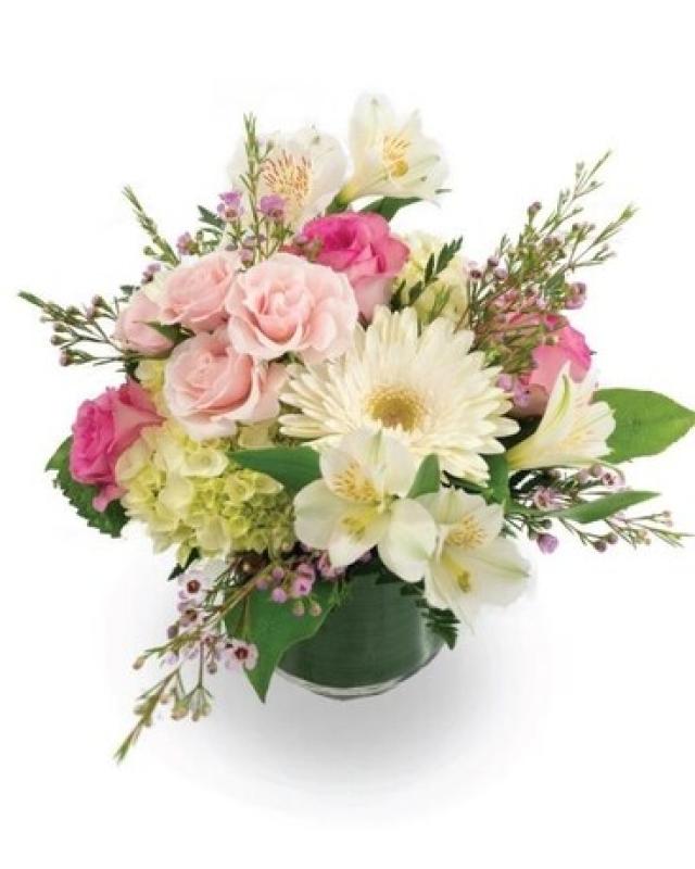 Send this absolutely adorable arrangement to the sweet pea in your life. Roses, gerbera daisies, and alstromeria in a short and compact design.