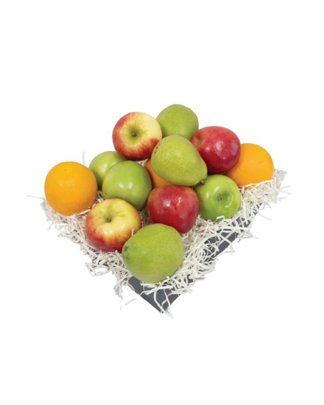 A tasty gift for any occasion! Our seasonal fruit baskets are full with a variety of apples, oranges, and pears. Each size comes with a decorative basket, wrapped with a bow, and a different amount of fruit: