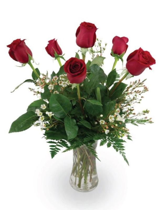 A fresh, classic arrangement of six roses, thoughtfully selected for their rich color and graceful form. Each bloom is paired with complimentary greenery to create a clean and timeless presentation. Displayed in a vase, this understated bouquet offers a meaningful expression of affection, appreciation or romance. Perfect for any occasion.