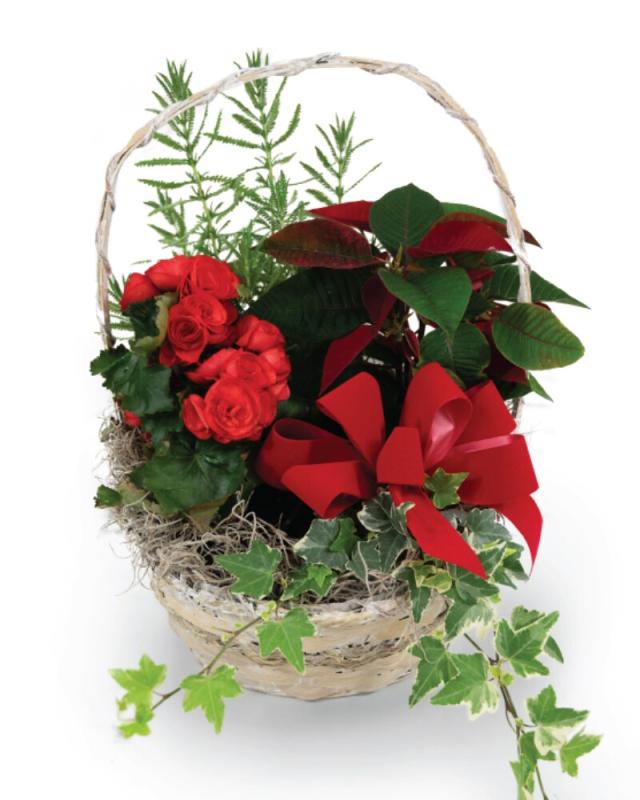 This holiday themed basket of blooming can contain poinsettias, holiday cacti, cyclamen, or other holiday themed plants.