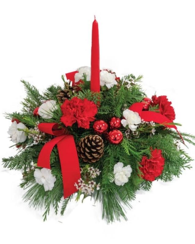 Round Centerpiece includes fresh winter evergreens, red carnations, white pomps, pine cones, ornaments and a candle.