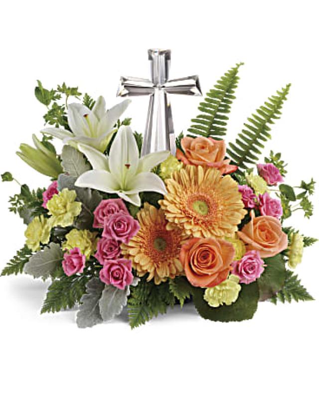 Nestled among bright orange gerberas, pink roses and white lilies, this precious crystal cross keepsake brings joyful reverence to your special occasion. Designed with spray roses, lilies, gerbera daises, mini carnations around a crystal cross keepsake.
