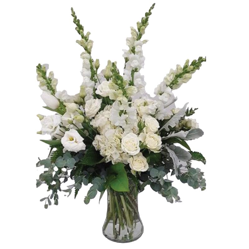 A striking expression of grace and remembrance, this tall all-white funeral arrangement is thoughtfully designed with premium white blooms such as roses, lilies, hydrangea, and seasonal accents. Artfully arranged in a clear glass vase, the design creates a beautiful sense of height and presence while maintaining a soft, serene elegance. Timeless and refined, this arrangement offers a meaningful way to honor a life, express sympathy, and provide comfort during a time of loss.
